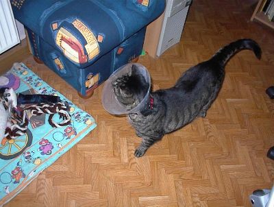 Wegen meiner doofen Blasen- und Harnwegs -Erkrankung mußte ich diesen Trichter tragen. Da bin ich überall angestoßen und hängen geblieben